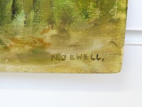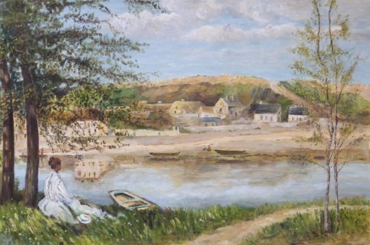N Jewell oil on board Edwardian lady by a boat overlooking a village on river or estuary, signed lower right, 51 x 76cm