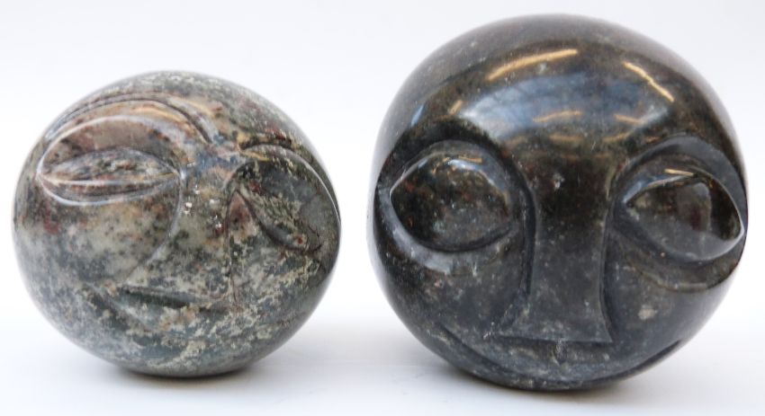 Two African Shona stone carvings of stylised heads, both signed Noel Mwanza, largest approximately 11cm long
