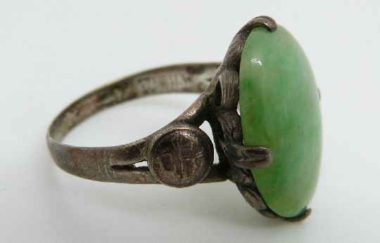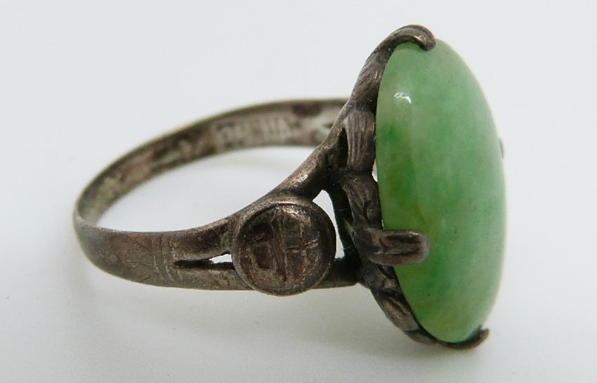A Chinese silver ring set with a jadeite cabochon, with character marks to the shoulders and marked China to band