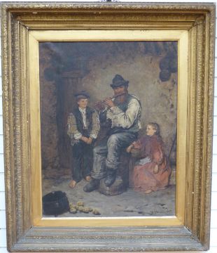 Frederick Gerald Kinnaird, (Irish, active 1864-1881) oil on canvas 19thC flautist playing to two children, the boy wearing a hat similar to a tam o'shanter, in heavy ornate gilded frame, signed lower right, picture 90cm x 70cm, in gilt frame