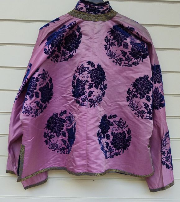A late 19th/20thC Chinese pink silk short coat with blue flock peony and butterfly decoration and silk lining