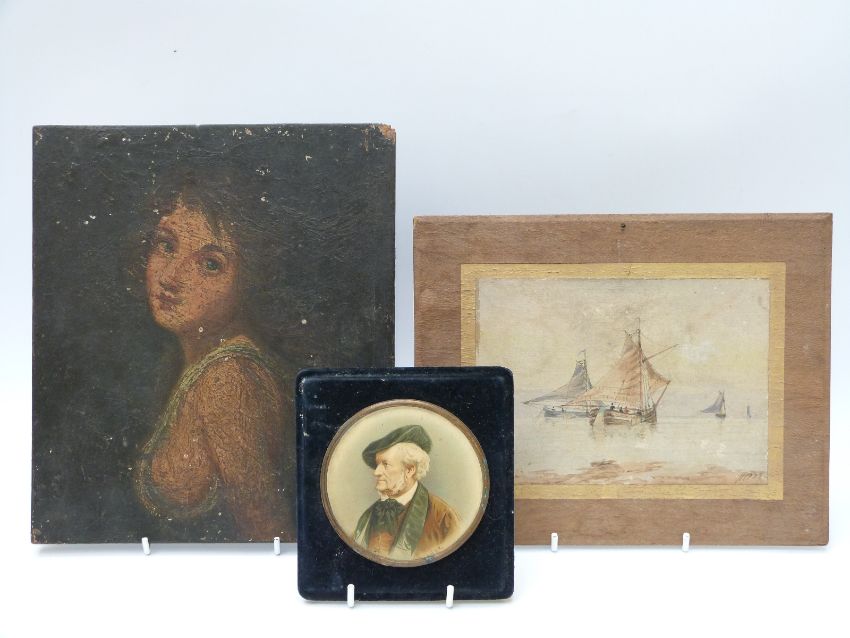 An 18thC or 19thC oil on board portrait 26 x 22cm, a watercolour of sailing ships and a miniature