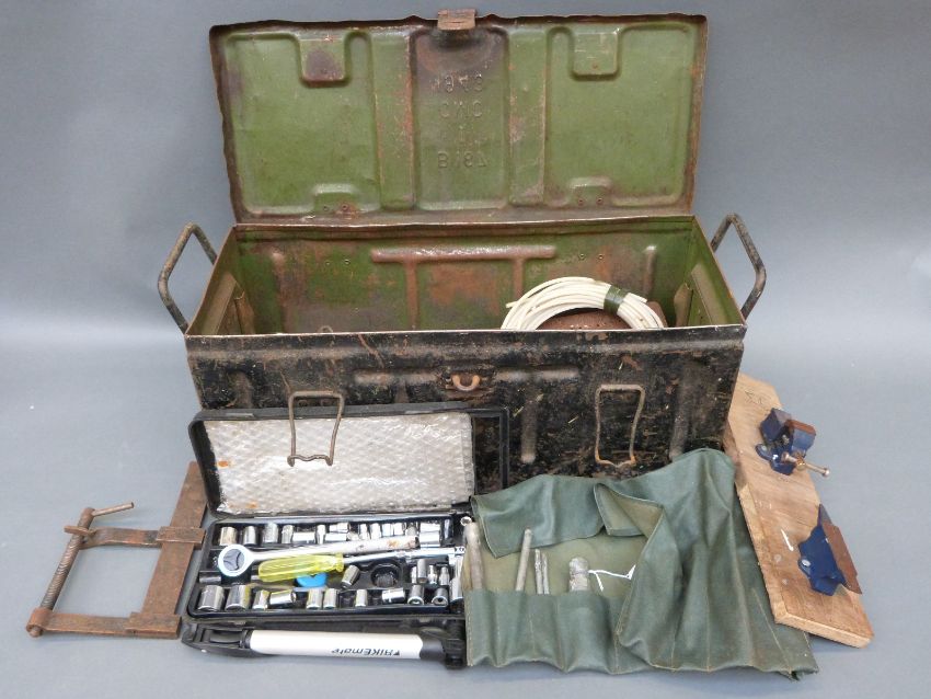 A 1943 metal tool / ammunition box containing largely engineer's / motorcycle / cycle related tools to include a side valve engine valve spring compressor, a 1960s Honda C50 clutch puller tool, spanners, pliers, socket set etc