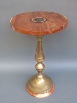An inlaid oak side table with Stroud Vintage Transport and Engine Club 27th annual rally 2001 Kemble Airfield plaque to top