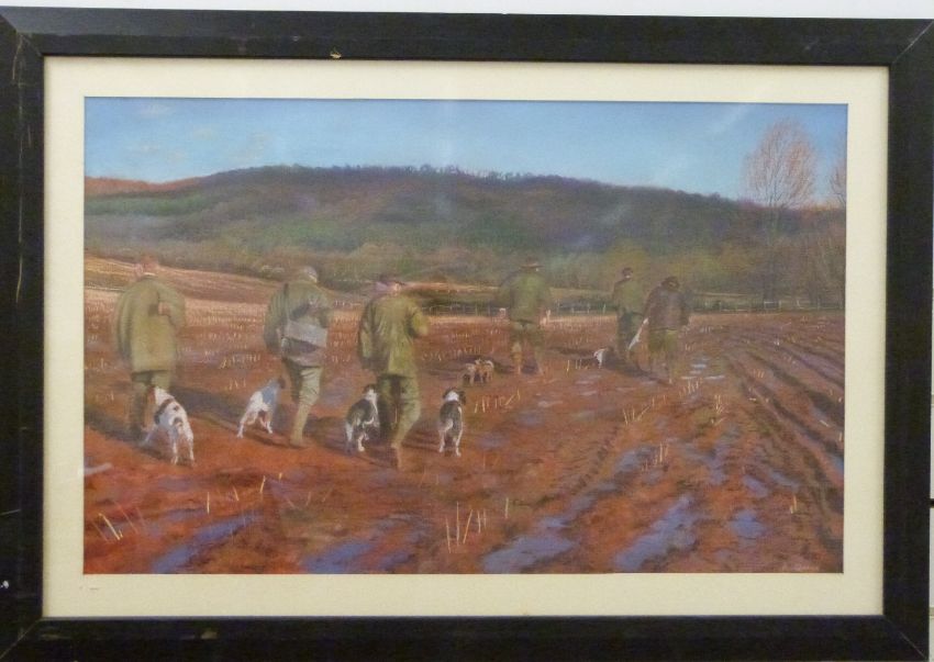 Andrew Quelch pastel 'Onto the Next Drive' shooting party in a field, signed lower right, 42 x 68cm