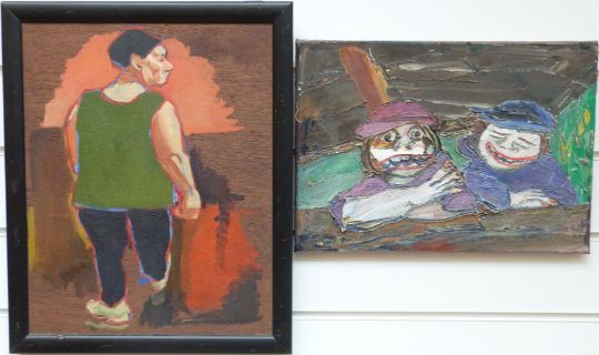 Modern acrylic on canvas of two people at a bar, 26cm x 36cm, inscribed verso and an acrylic on panel portrait of a man, 37cm x 29cm