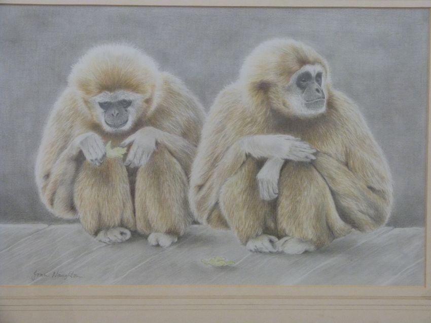 Joan Naughton pencil and coloured drawing of two seated gibbons, 30cm x 46cm
