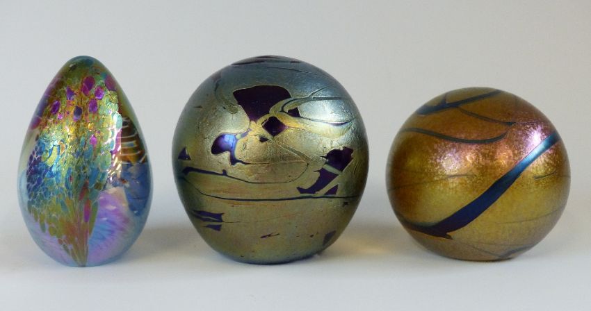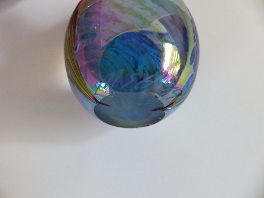 A collection of millefiori and iridescent paperweights including John Deacons Bull, Strathearn, Perthshire, Glass Eye, Mount St Helens etc