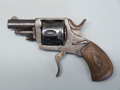 Belgian .320 six shot revolver with chequered grips, folding trigger and 1.5 inch barrel engraved 'Belgique', overall length 14.5cm.
