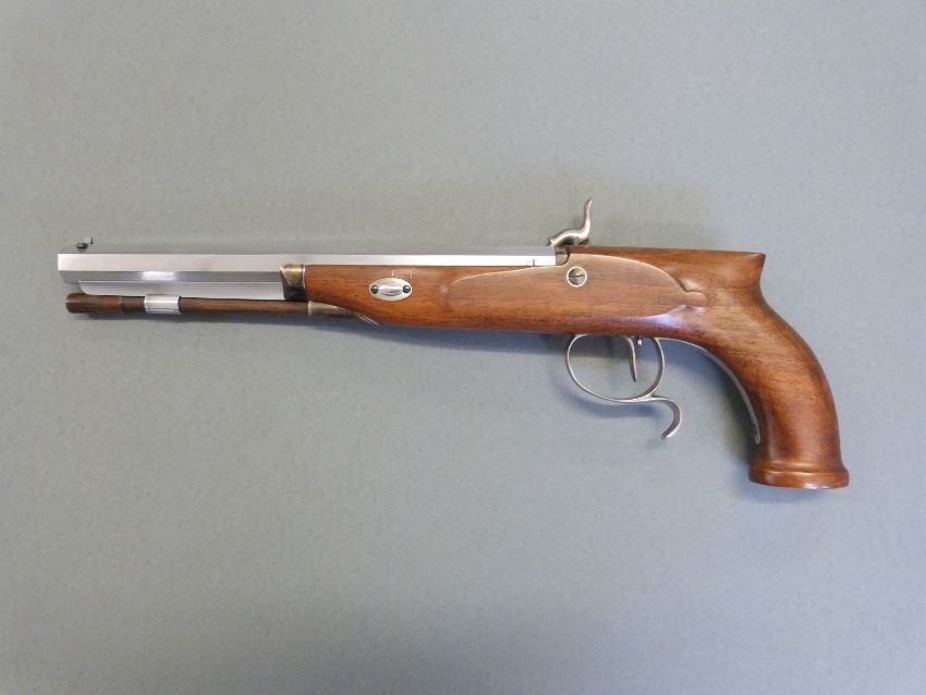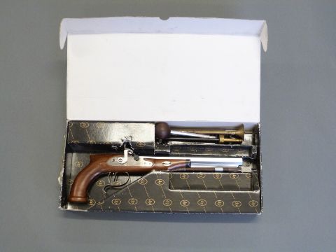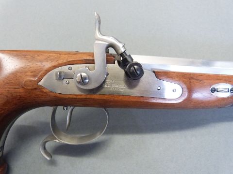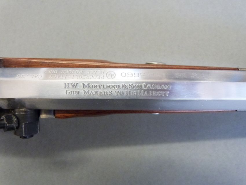 Pedersoli HW Mortimer & Son .44 percussion hammer action pistol with named lock, shaped grip, spurred trigger guard, open sights, horn tipped ram-rod and rifled 10 inch named and rifled octagonal barrel, overall length 42cm, serial number PD15660, in original box with accessories. PLEASE NOTE THAT A VALID RELEVANT FIREARMS/SHOTGUN CERTIFICATE IS REQUIRED TO HANDLE/PURCHASE THIS ITEM.