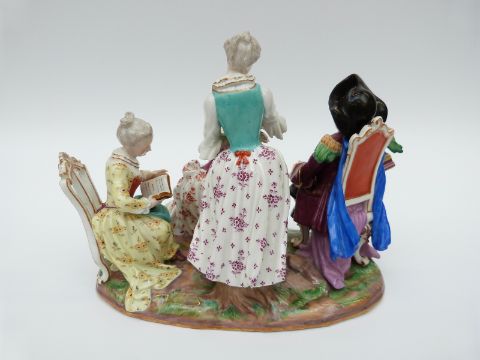 A 19thC Meissen figural group Cupid in Disguise, modelled as a winged Cupid seated wearing hat and long jacket, holding an open book with three maidens in attendance, on shaped oval scroll moulded base. For similar see Sotheby's Olympia 6/7/2005 Lot 1, height 18cm