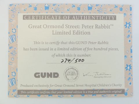 Gund Beatrix Potter Peter Rabbit Teddy bear A28631, limited edition 274/500, produced for Great Ormond Street Hospital, 35cm tall, in original box with certificate of authenticity