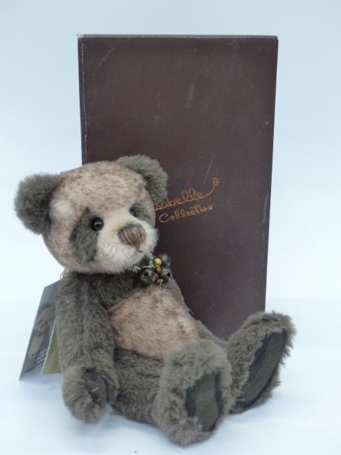 Charlie Bears Isabelle Collection Teddy Bear Isla with brown and grey mohair, bell necklace and jointed limbs, limited edition 238/300, 23cm tall, with box and certificate of authenticity