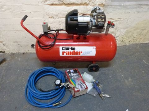 Clarke twin cylinder 120 litre air compressor, spray equipment etc