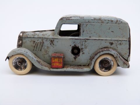 Tri-ang Minic clockwork tinplate Ford Light Van with pale blue body, cream tyres and Shell petrol can