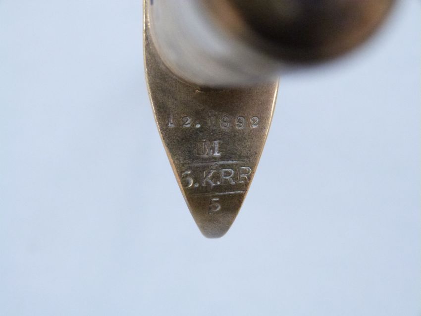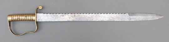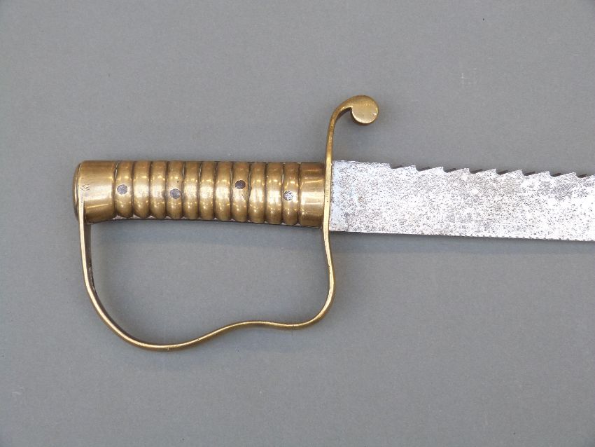 British Army 1856 pattern pioneers sawback sword with brass hilt, marked 12. 1892 M 5 KRR 5 (King's Royal Rifles) to guard, blade length 57cm