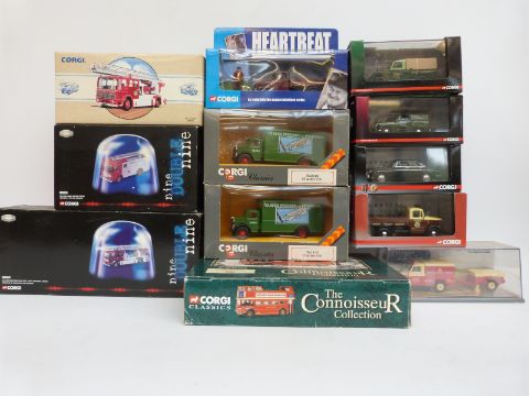 Eleven Corgi diecast model vehicles including nine Double nine, Land Rover, Five Vehicles, Heartbeat, The Connoisseur Collection, Vanguards etc, all in original boxes