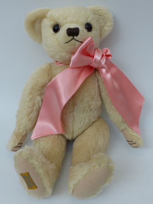 Merrythought Alpha Farnell Teddy bear with blond mohair, pink ribbon, growler and jointed limbs, 44cm tall