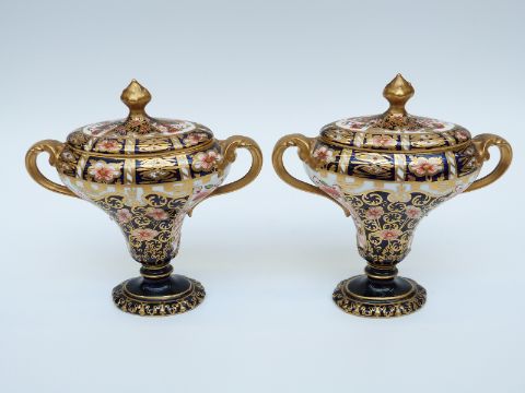 A pair of Royal Crown Derby Imari covered pedestal twin-handled vases/urns with 1326/6299 NF to base, 15cm tall