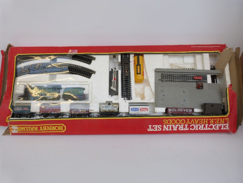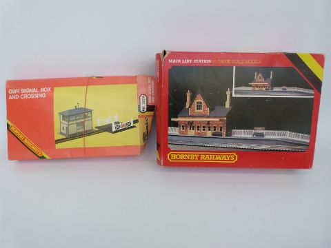 Hornby 00 gauge LNER Heavy Goods Train set R692, together with a Main Line Station R592 and a GWR Signal Box and Crossing R186, all in original boxes
