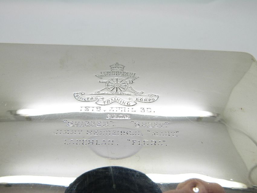 WWI Edinburgh University Officer Training Corps hallmarked silver cigarette box inscribed 30 April 1918 from 'Skipper', 'Shoey', Jimmy Henderson, 'Mary' Lauchlan and 'Flora', Birmingham 1917, width 16cm