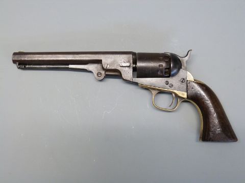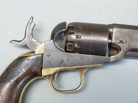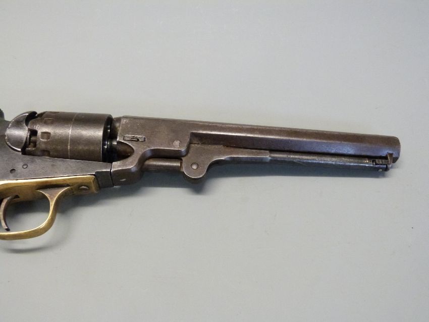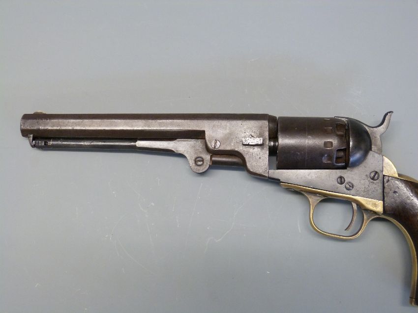 Manhattan Navy .31 six shot revolver with steel and brass frame, mahogany grips and 6.5 inch octagonal barrel stamped 'Manhattan Fire Arms Co. Newark N.J. Patented March 8. 1864', overall length 31cm, serial number 4774.