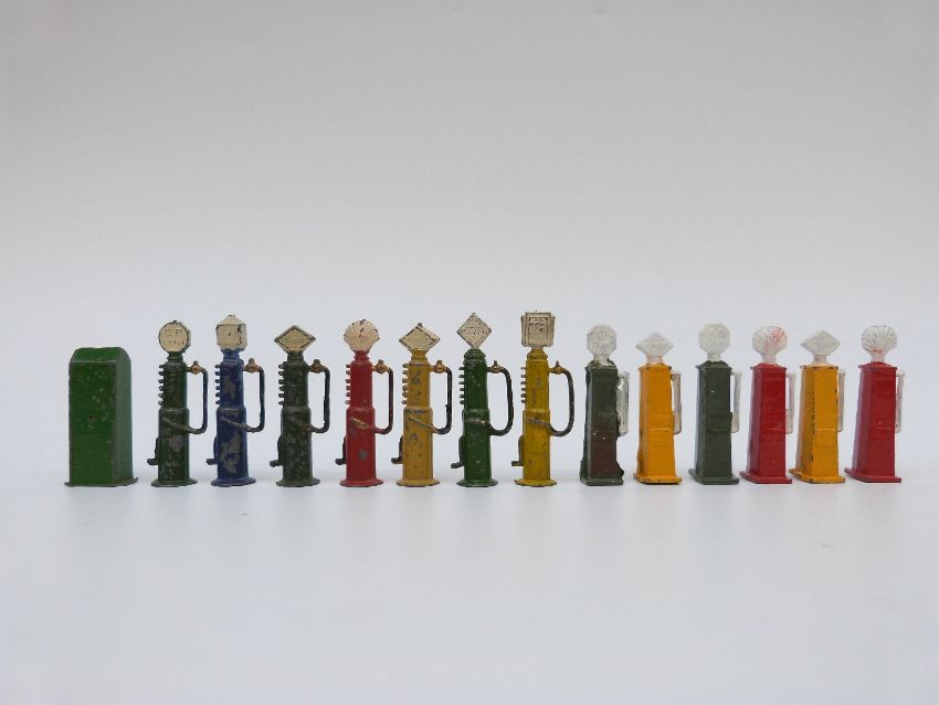 Fourteen Dinky Toys, Britains and similar diecast model petrol, oil and other fuel pumps including Shell, BP etc