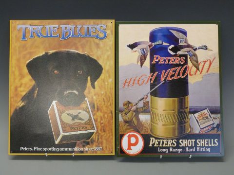 Two Peter's shotgun cartridge advertising/ shop display signs 'True Blues' and 'High Velocity, each 40 x 31cm