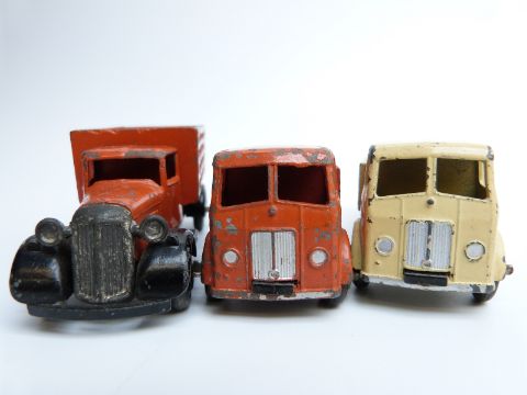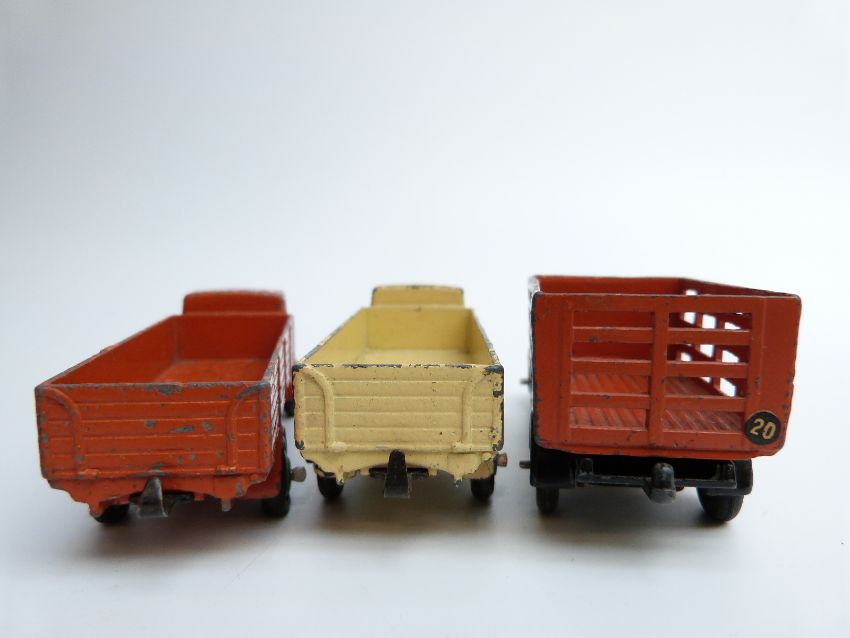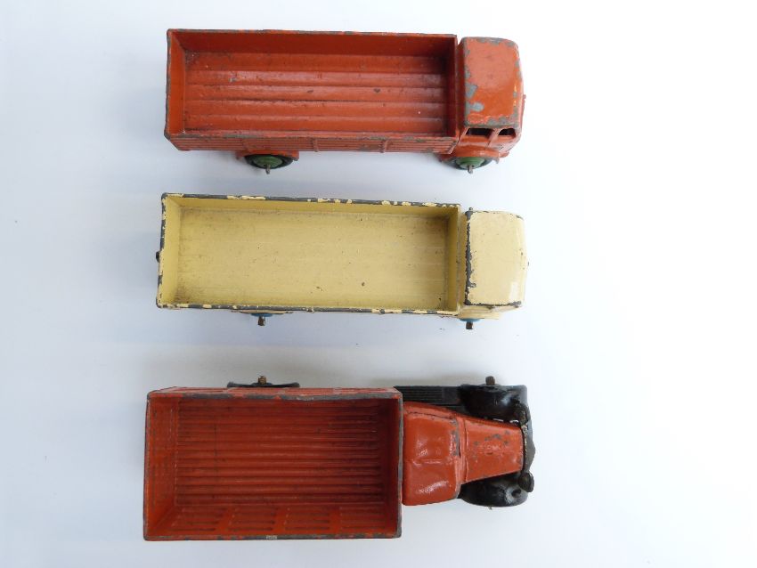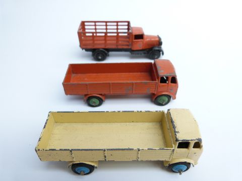 Three pre-war Dinky Toys diecast model lorries including two trucks and an animal wagon.