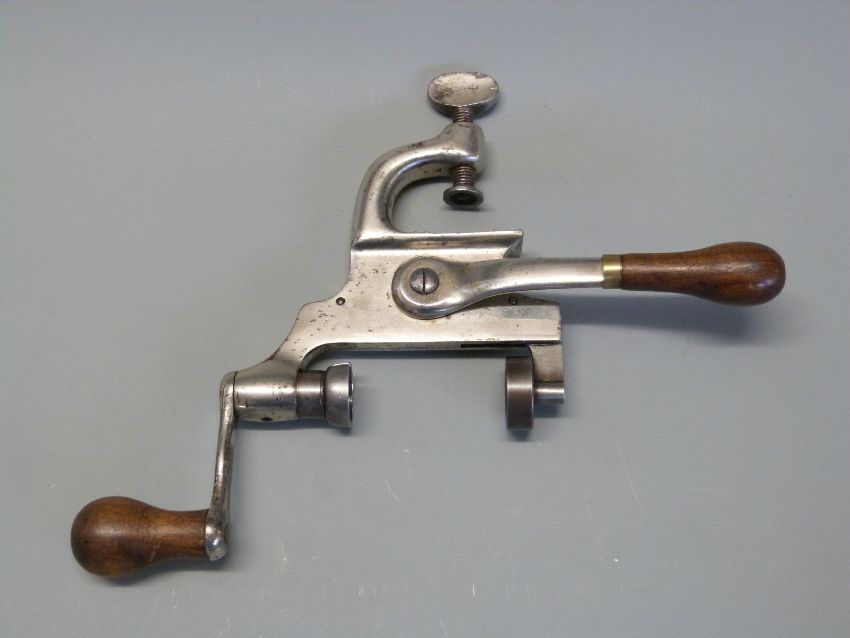 French steel cartridge loading tool with turned wooden handles stamped A R Marque Deposee Armes et Cycles Manufacture Francaise St Etienne.