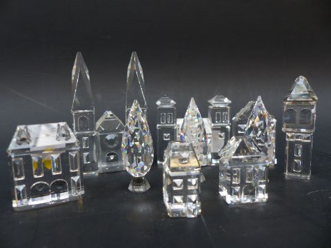 Ten Swarovski Crystal Silver City buildings and scenery including cathedral, city gates, houses etc