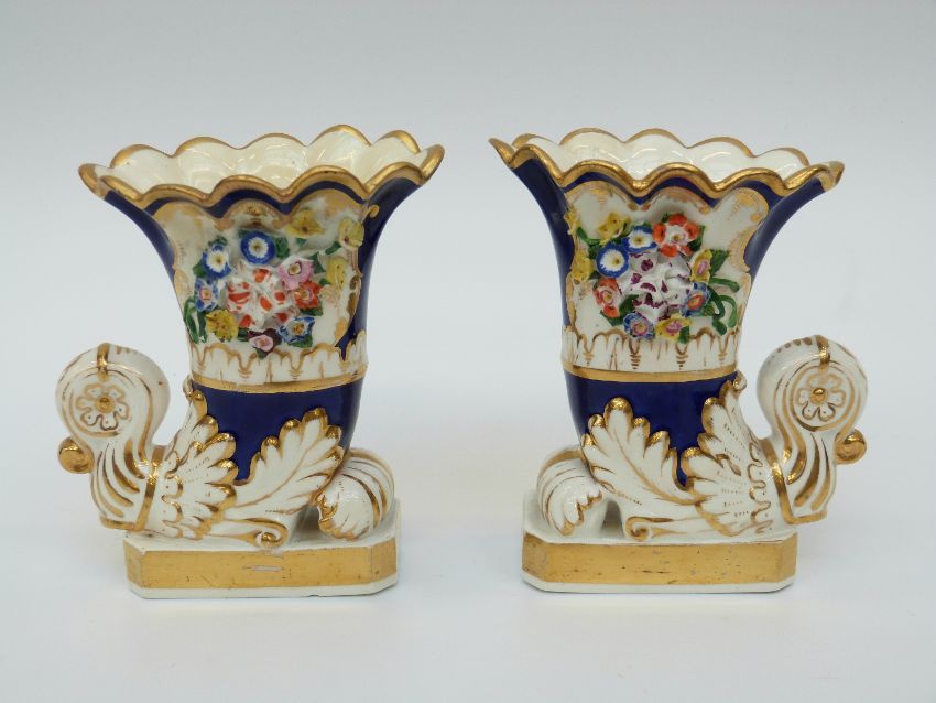 A pair of early 19thC Derby spill vases with applied flower decoration