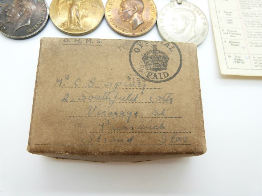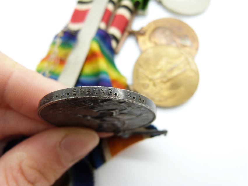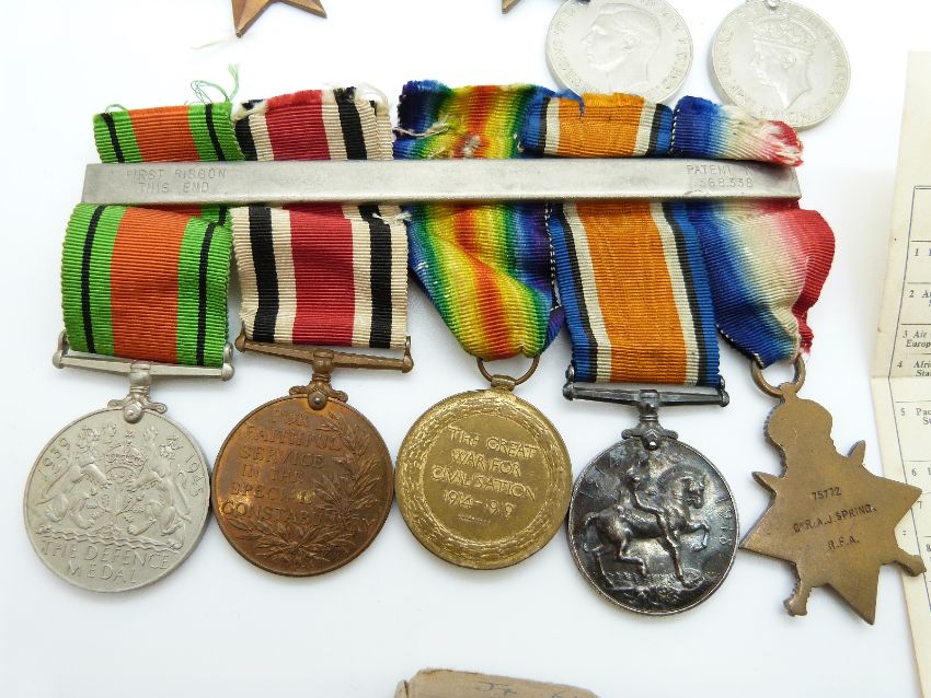 Father and son WWI and WWII medal group, the WWI set of five medals comprising 1914 Star, War medal, Victory medal, Special Constabulary service medal and 1939-45 Defence medal, awarded to 75772 Gnr A J Spring, RA, together with WWII set of four medals comprising 1939-45 Star, Atlantic Star, Defence medal and War medal, awarded to 611648 C G Spring, in original box