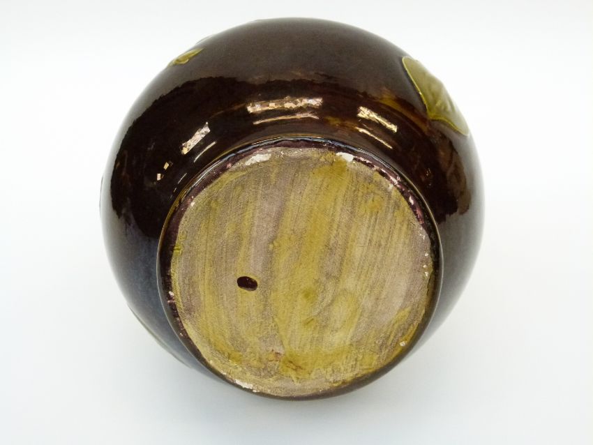 A Bretby style art pottery vase decorated with flowers and ring handles in relief on a brown ground, 28cm tall