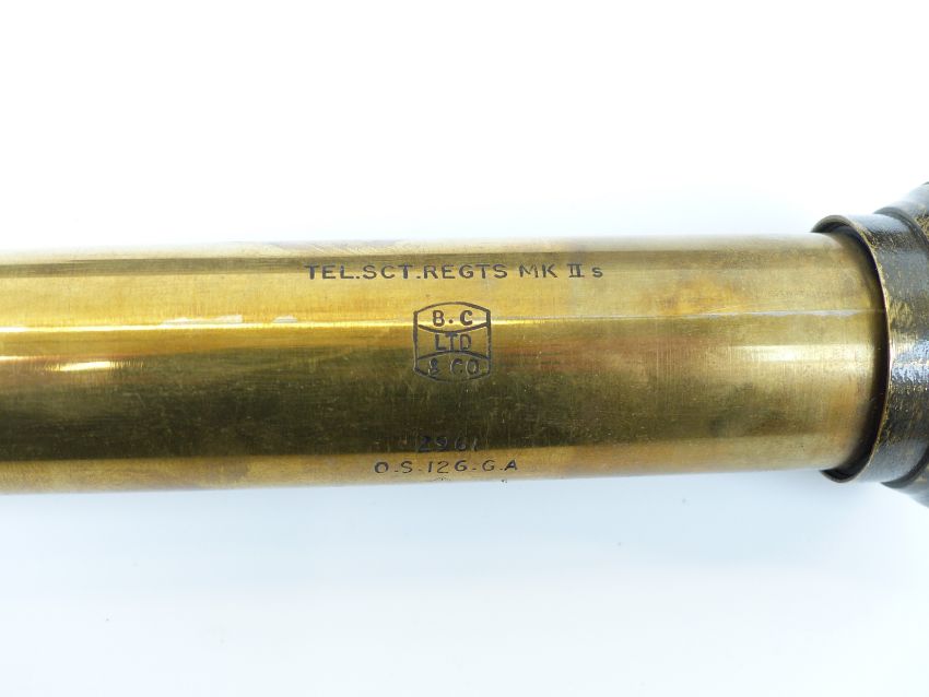 Brass three draw telescope with military mark and Tel.Sct.Regts mkIIs, 2961 O.S.126.GA stamped to first draw with B.C Ltd & Co maker's mark, in original leather case