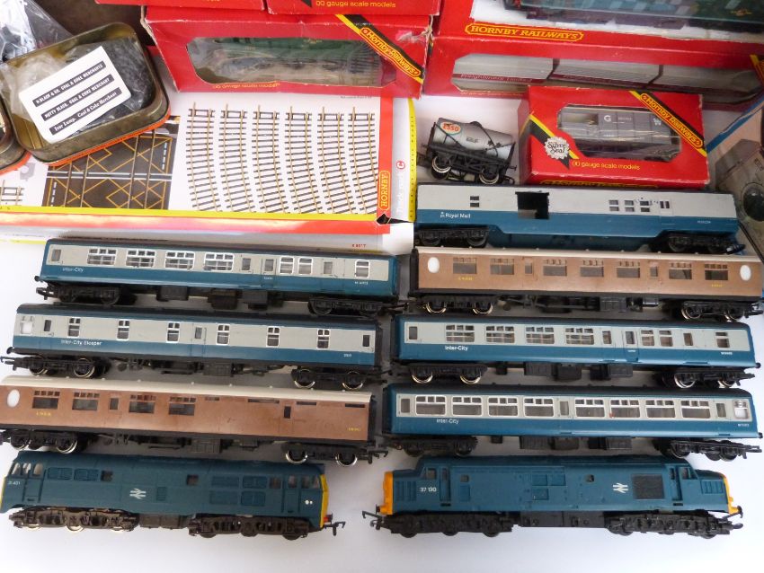 A quantity of mainly Hornby 00 gauge railway rolling stock and accessories including HST, Class 37, 25 and 08 diesel locomotives, controller etc
