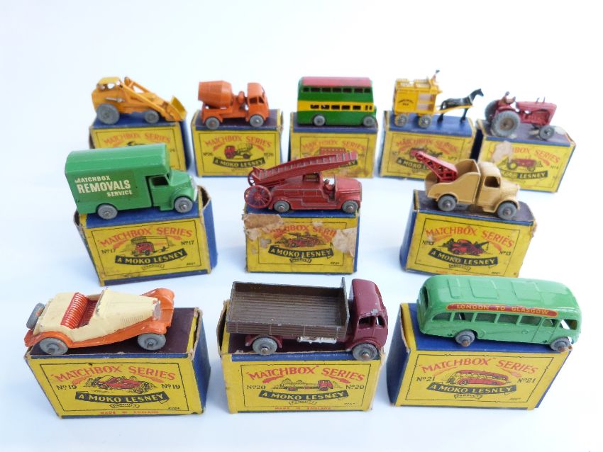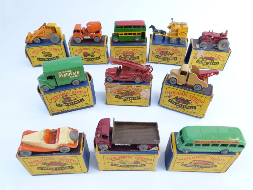 Eleven Moko Lesney Matchbox diecast model vehicles 4, 5, 7, 9, 13, 17, 19, 20, 21, 24, 26 all in original B1 boxes.