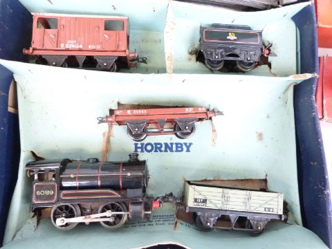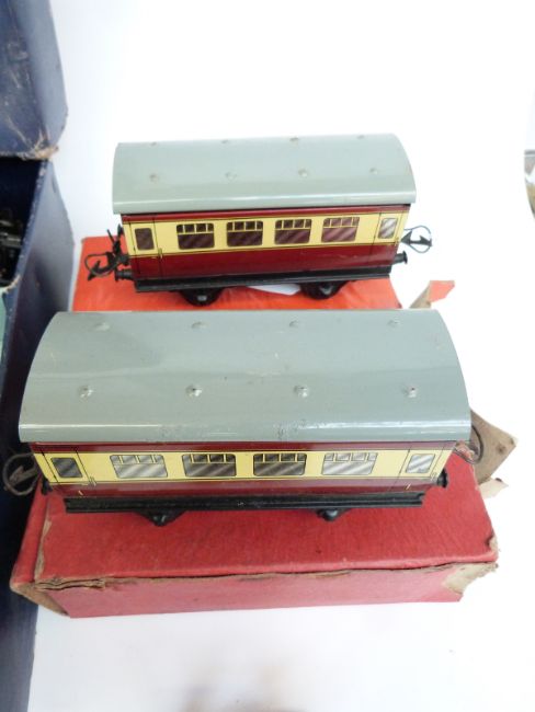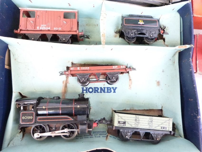Hornby 0 gauge No.50 goods set with clockwork BR tender locomotive together with two boxed carriages, buffer stop etc