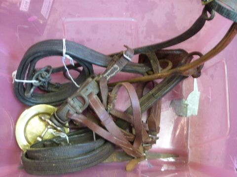 A quantity of metalware to include foot operated bellows, brass wall mounted candle holders, horse tack etc
