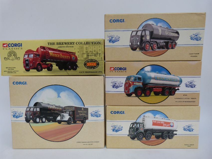 Five Corgi Classics and Commercials diecast model tankers and lorries comrprising Tate & Lyle Set 97781, Foden Tanker Guinness 97950 and Milk 97951, Atkinson Eliptical Tanker 97162 and The Brewery Collection Vaux Brewery Ltd 27901, some limited edition, all in original boxes