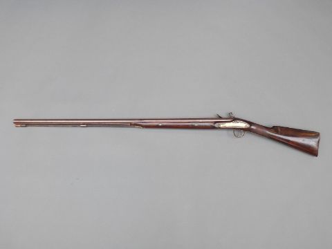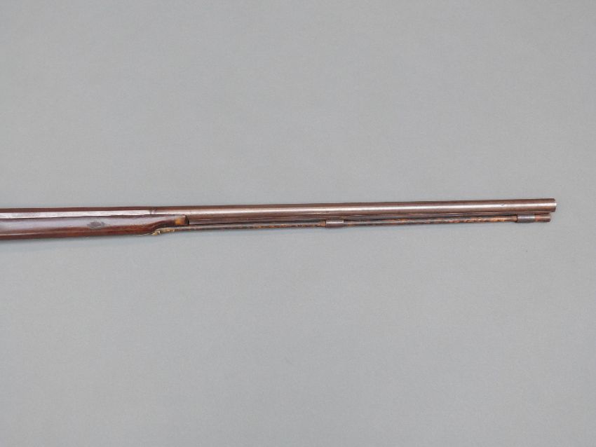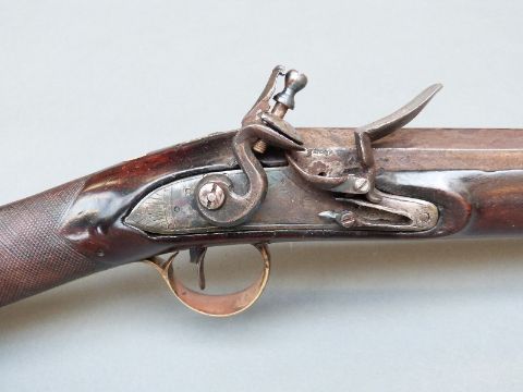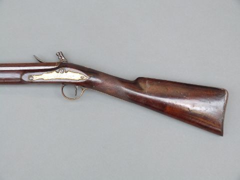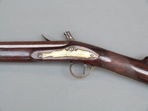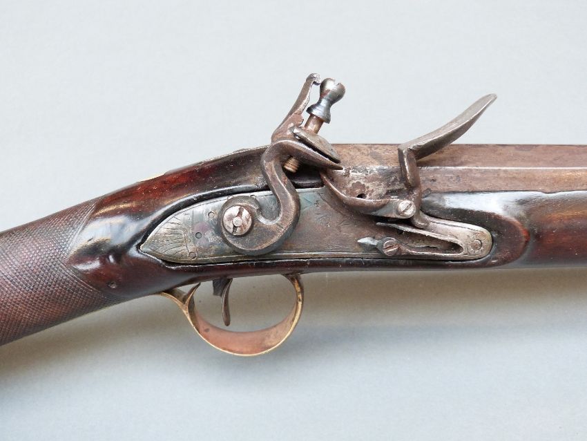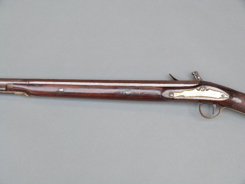 Flintlock hammer action sporting gun with engraved lock, top plate and pineapple finialled trigger guard, chequered grip, steel butt plate, brass mounts, horn tipped forend, horn tipped wooden ram-rod, vacant shield cartouche to the wrist and 38" barrel, overall length 135cm