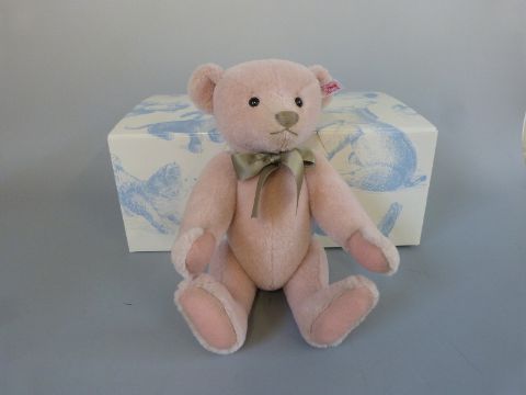 Steiff Teddy Bear Lily-Rose with pale pink mohair, shaved snout, green bow and jointed limbs, limited edition 73/1500, 33cm tall, with box and certificate of authenticity