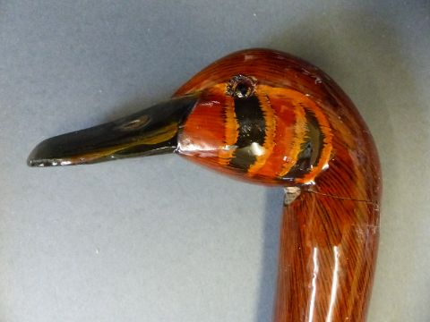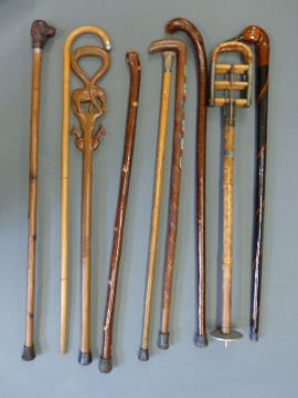 A group of walking sticks including some with animal head handles