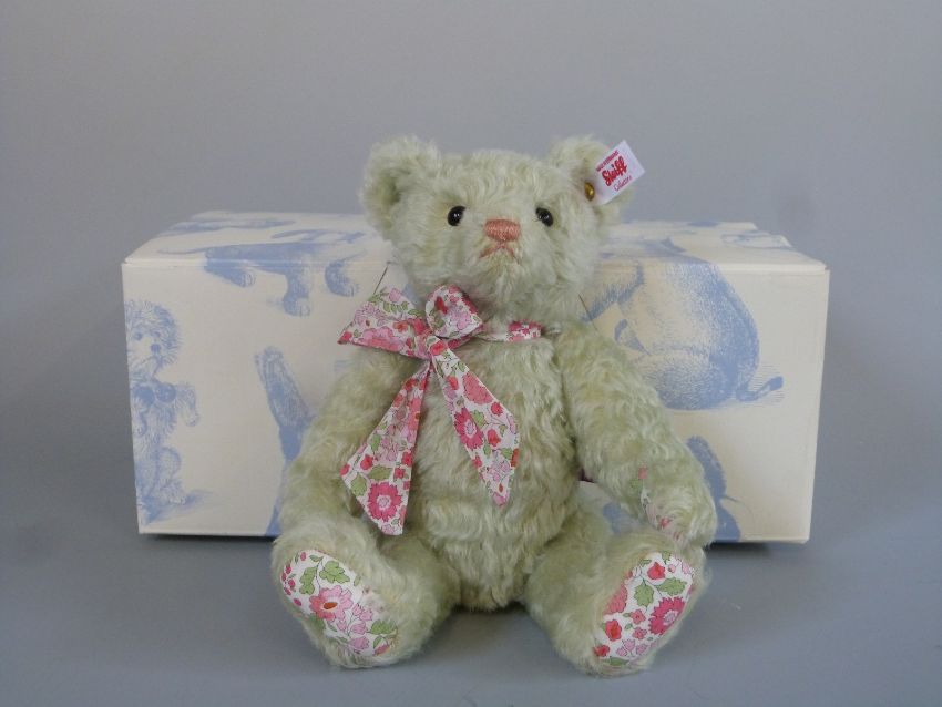 Steiff Teddy Bear Fleur with light green mohair, jointed limbs, floral pads and Liberty bow, UK, Ireland & Asia limited edition 126/1500, 26cm tall, with box and certificate of authenticity