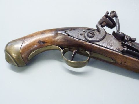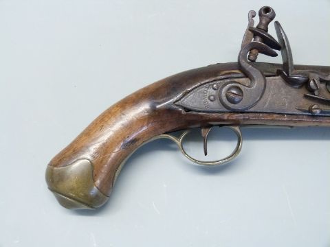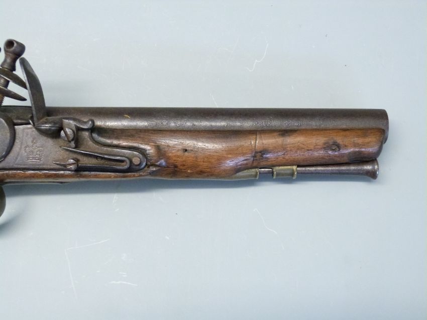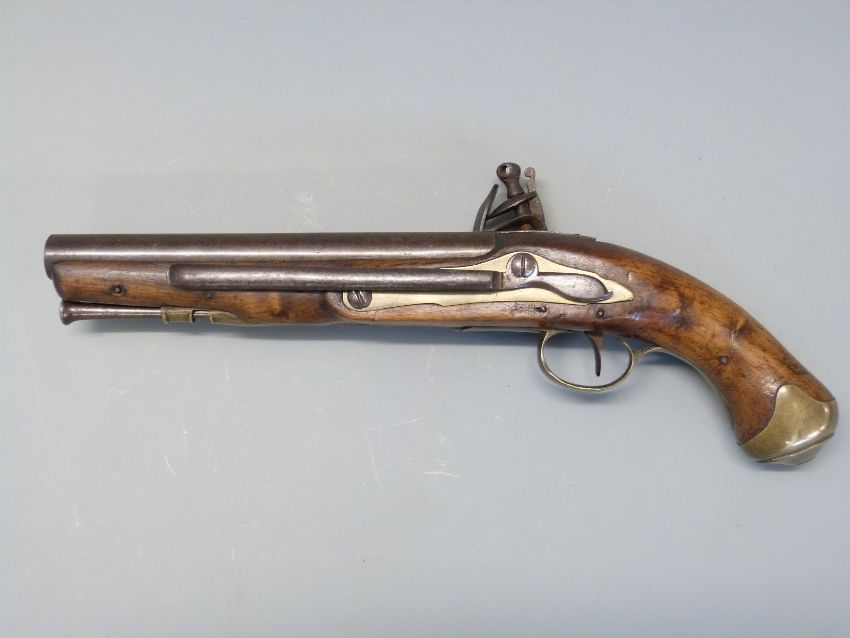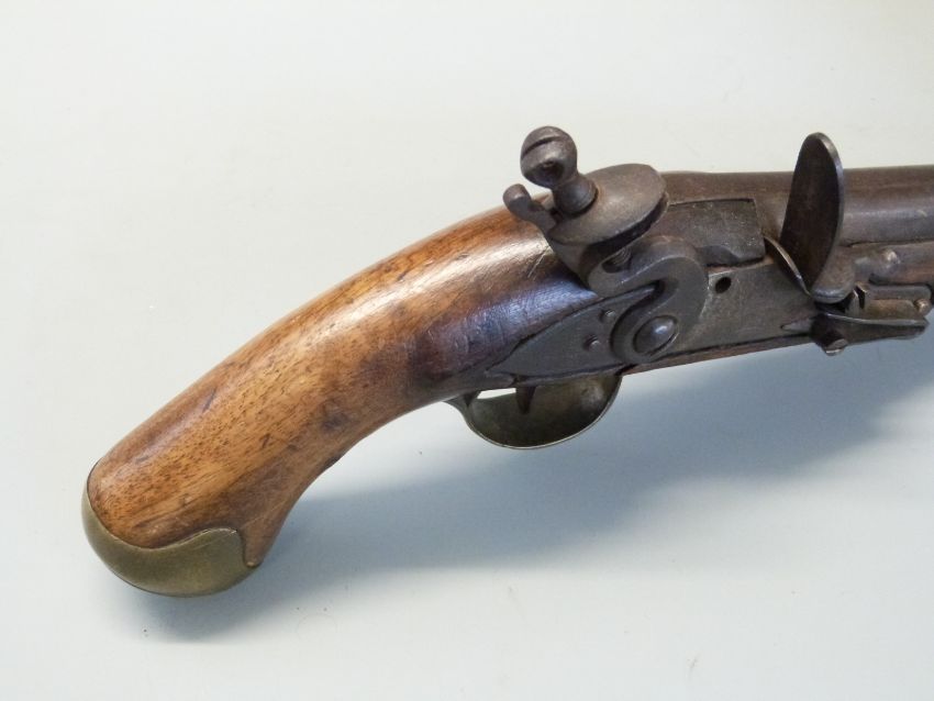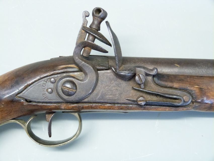 Flintlock hammer action Dragoon pistol with lock plate stamped 'Tower' and with crown cypher, brass trigger guard, butt plate and mounts, steel ram-rod, steel belt hook and 8.25 inch barrel stamped with proof marks, overall length 38cm.