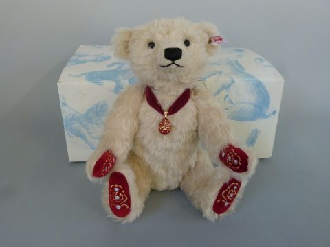 Steiff Teddy Bear Nicholas The Fabergé Inspired Bear with cream mohair, red embroidered pads, Fabergé style egg pendant and jointed limbs, limited edition 261/1917, 35cm tall, with box and certificate of authenticity