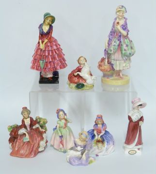 Eight Royal Doulton figurines to include Priscilla, Phyllis and a Kate Greenaway Sophie
