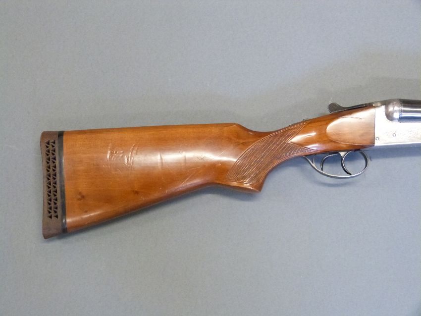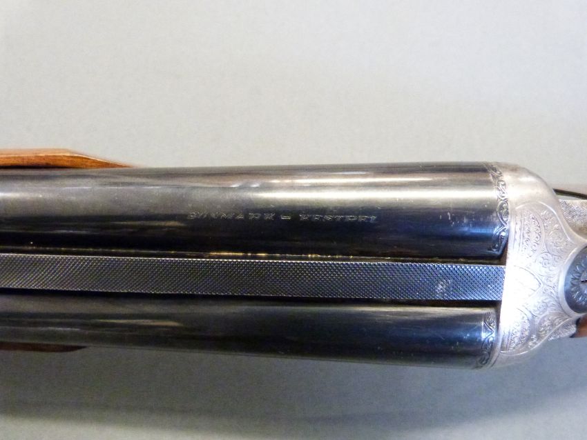 Gunmark Kestrel 12 bore side by side shotgun with named and engraved locks, engraved top plate, top lever, underside and trigger guard, chequered semi-pistol grip and widened forend, double trigger and 24" barrels, overall length 103.5cm, length of pull 36cm, serial number 328786. PLEASE NOTE THAT A VALID RELEVANT FIREARMS/SHOTGUN CERTIFICATE IS REQUIRED TO HANDLE/PURCHASE THIS ITEM.
