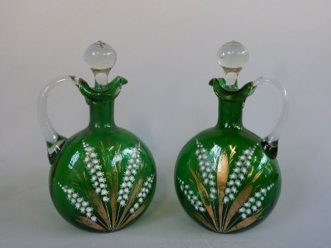 An oil lamp and two enamelled glass decanter jugs