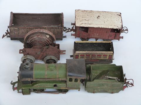 Hornby 0 gauge 0-4-0 clockwork tender locomotive, spare motor and three wagons and coaches
